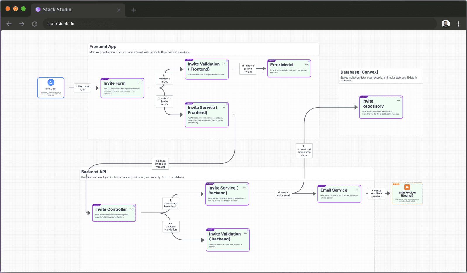 Ask for a new capability, refactor, or improvement. Stack Studio uses the map to understand what exists, what’s missing, and what needs to change.